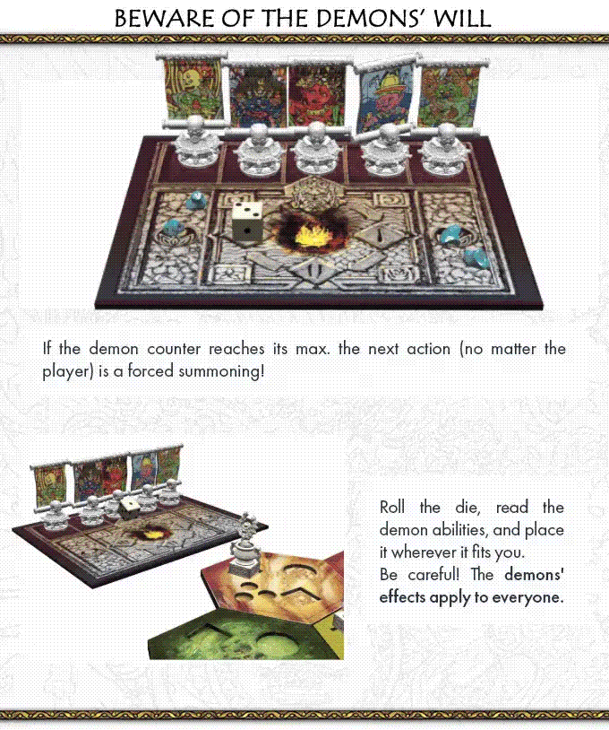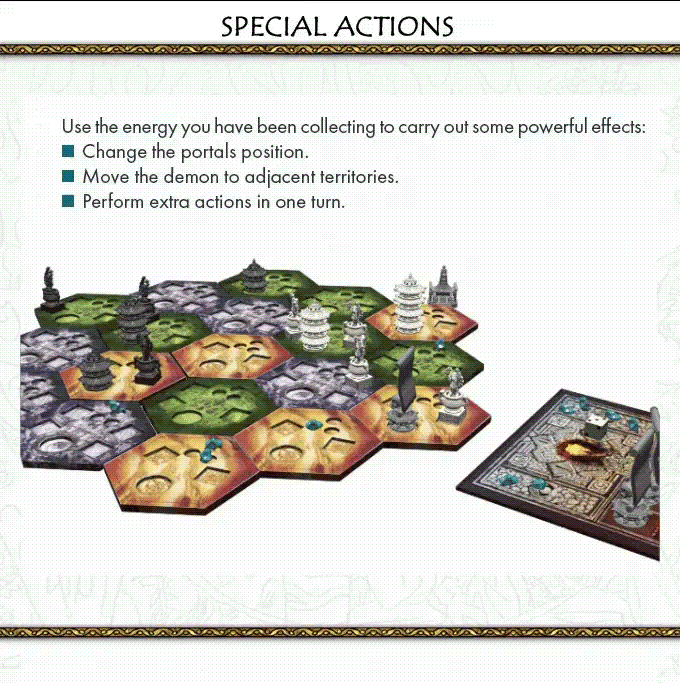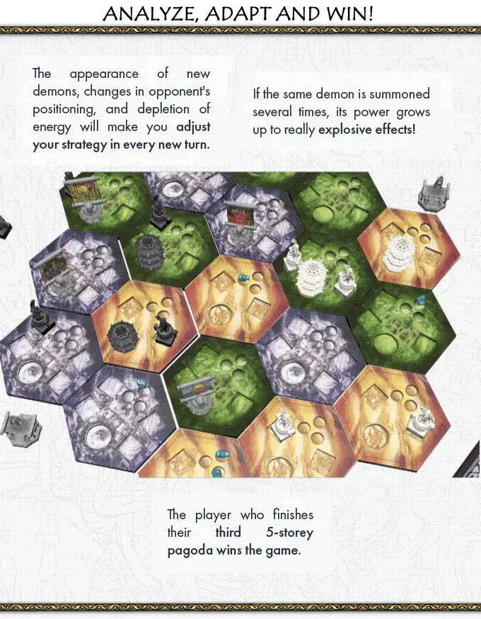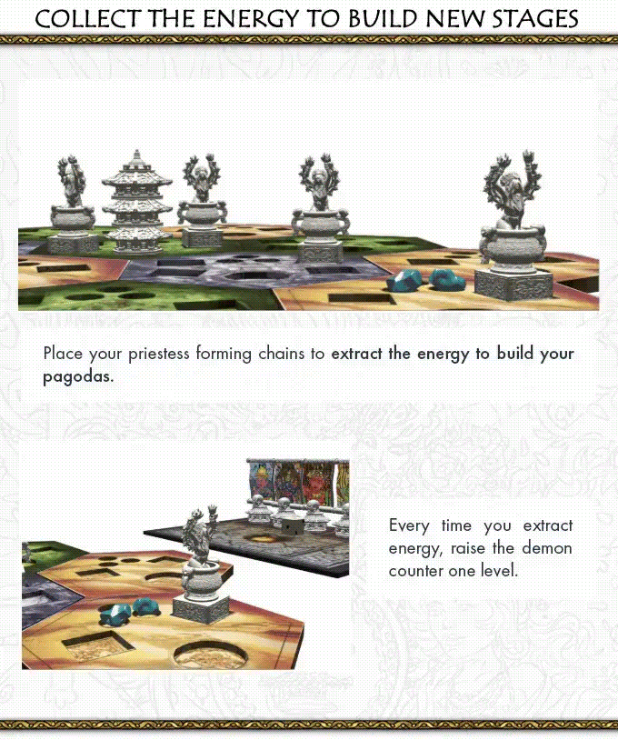 Absorbe la energía de los territorios sagrados, despliega tus unidades y domina a tu contrincante completando tres pagodas en un tablero variable. ¡Pero cuidado con los demonios! Su aparición cambiará las reglas y tal vez tu destino…